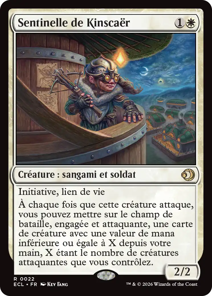 Sentinelle de Kinscaër trouvera sa place dans des stratégies qui cherchent à déborder votre adversaire sur le champ de bataille tout en bénéficiant de synergies entre créatures, et pourquoi pas dans un deck typal Sangami.