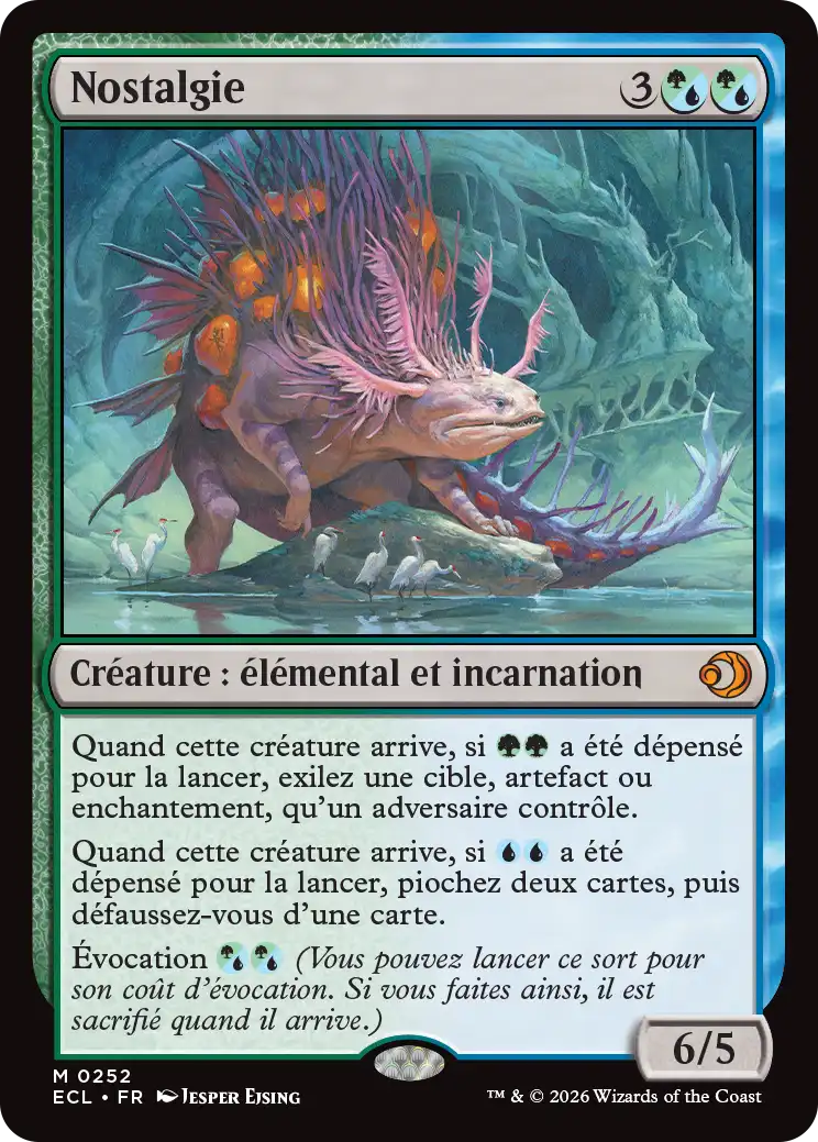 Selon la couleur de mana utilisée pour la lancer, Nostalgie offre deux modes d’utilisation : pour 2 manas verts, elle peut exiler un artefact ou un enchantement adverse, offrant un outil de gestion efficace contre de nombreuses cibles. Pour 2 manas bleus, elle permet de piocher deux cartes puis d’en défausser une, générant ainsi un avantage de cartes et facilitant l'accès à vos ressources clés.