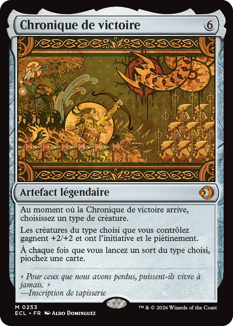 Chronique de victoire fait office de condition de victoire et de moteur de pioche efficace, s’intégrant naturellement dans toutes les stratégies centrées sur un type de créature, notamment en format Commander.