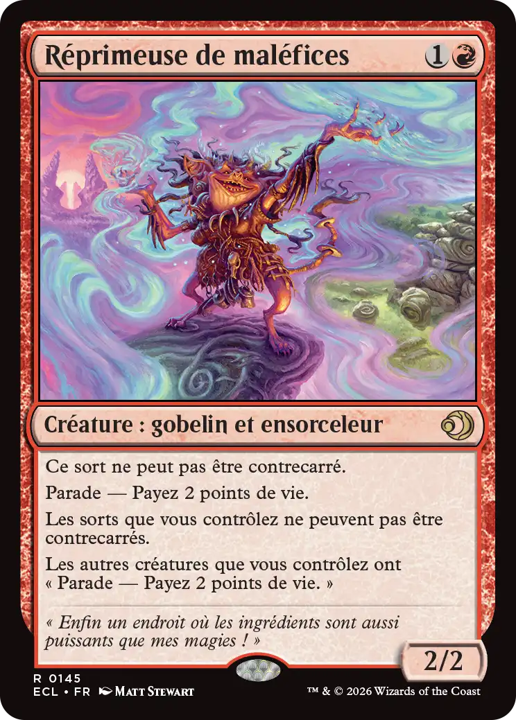 Réprimeuse de maléfices est un gobelin 2/2 pour 2 manas. Il ne peut pas être contrecarré et votre adversaire devra payer 2 points de vie pour le cibler grâce à la parade.