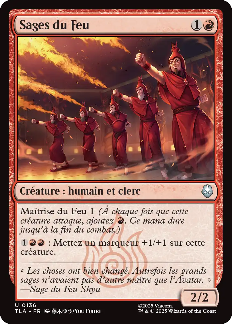 Sages du Feu est une 2/2 pour 2 manas avec Maîtrise du Feu 1. Sa capacité activée pour 3 manas dont 2 rouges lui permet de gagner un marqueur +1/+1.