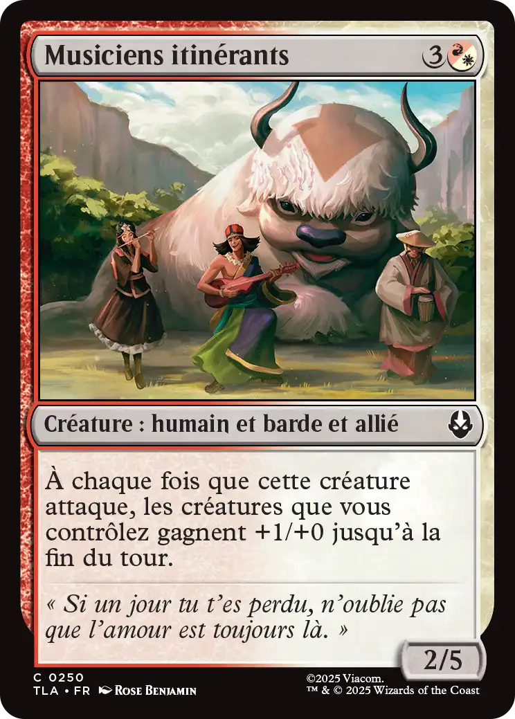 Musiciens itinérants est une 2/5 qui booste l'ensemble de vos créatures à chaque attaque en leur donnant +1/+0. Il bénéficie de son propre effet et attaque donc en tant que 3/5.