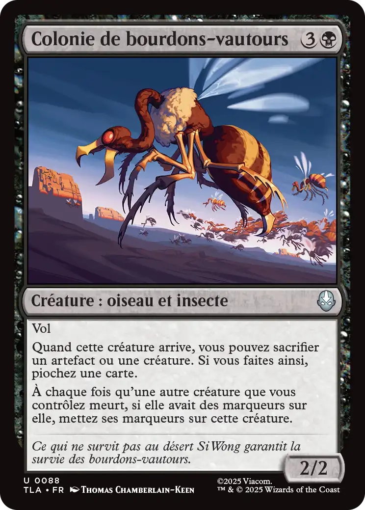 Colonie de bourdons-vautours est une 2/2 avec le vol qui vous fait piocher une carte en arrivant en jeu si vous sacrifiez un artefact ou une créature. Lorsqu'une autre de vos créatures meurt, vous pouvez transférer ses marqueurs sur la colonie. Vous obtenez ainsi une véritable menace avec une capacité d'évasion.