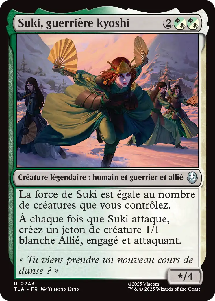 Suki, guerrière kyoshi a une force égale à votre nombre de créatures. Elle crée un nouveau jeton 1/1 allié engagé et attaquant à chaque fois qu'elle attaque.