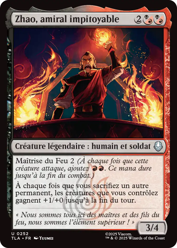 Zhao, amiral impitoyable est une 3/4 pour 4 manas avec la Maîtrise du Feu 2. Il booste l'ensemble de vos créatures en leur donnant +1/+0 jusqu'à la fin du tour à chaque fois que vous sacrifiez un autre permanent.