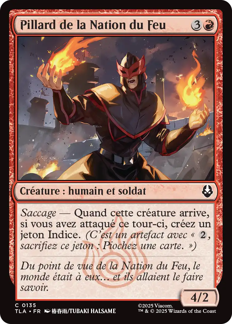 Pillard de la Nation du Feu est une 4/2 pour 4 manas qui vous donne un jeton indice en arrivant en jeu si vous avez attaqué ce tour-ci.