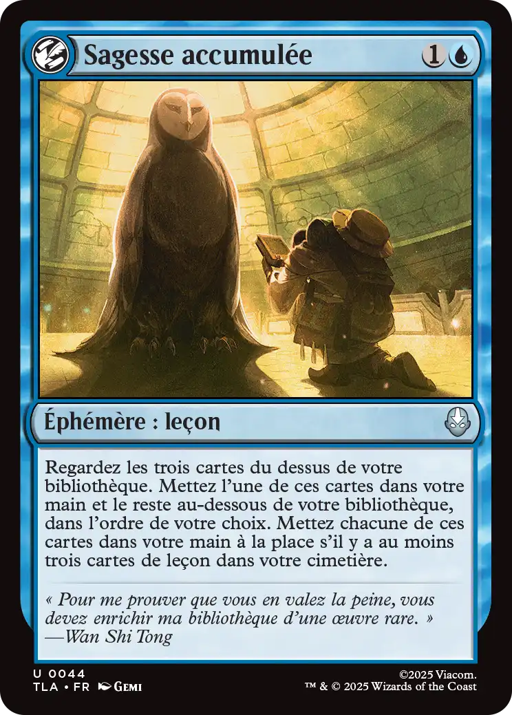 Sagesse accumulée est une leçon en éphémère pour deux manas qui vous permet de regarder les 3 cartes du dessus de votre bibliothèque et d'en mettre une dans votre main. Si vous avez au moins 3 leçons au cimetière, vous mettez les 3 cartes regardées dans votre main à la place.