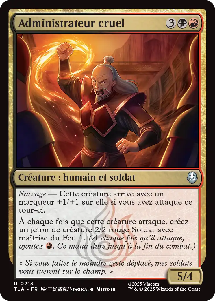 Administrateur cruel est une 5/4 pour 5 manas qui arrive en jeu avec un marqueur +1/+1 si vous avez attaqué ce tour-ci. À chaque fois qu'il attaque, vous créez un jeton 2/2 avec Maîtrise du Feu 1.