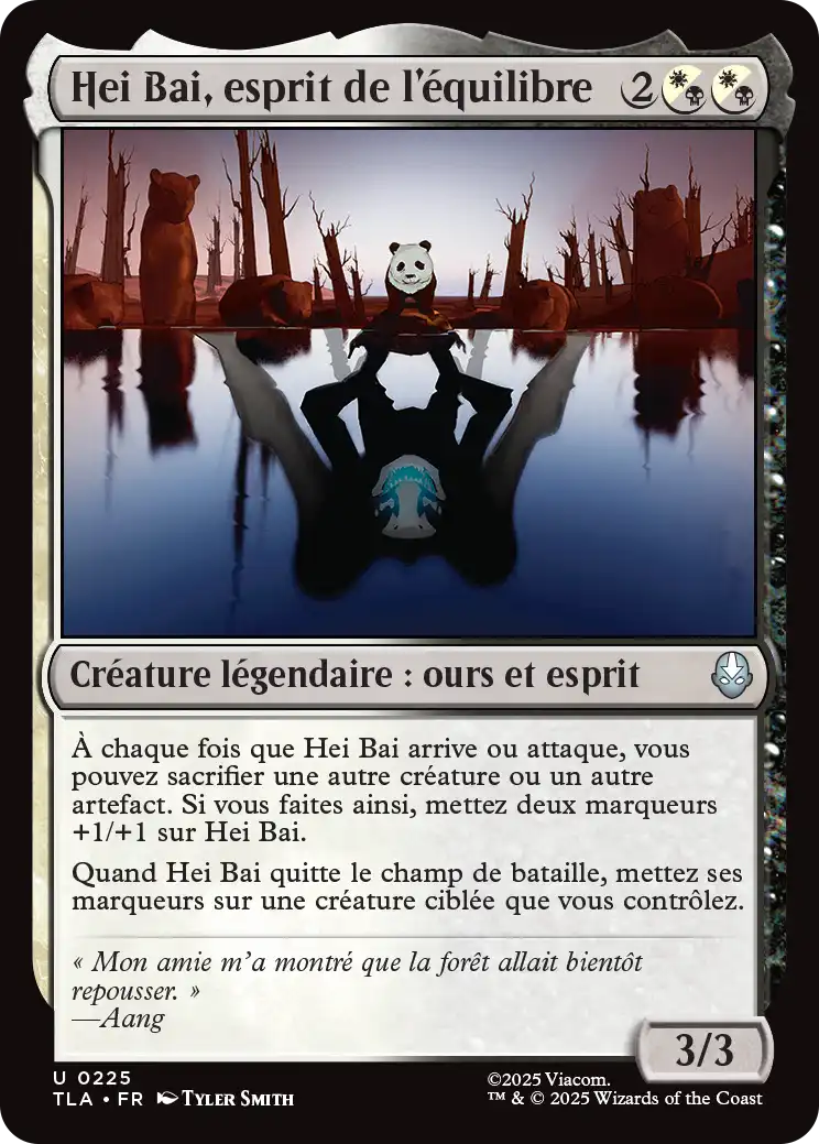 Hei Bai, esprit de l'équilibre vous permet de sacrifier une créature ou un artefact à son arrivée en jeu et à chaque fois qu'il attaque. Il gagne alors 2 marqueurs +1/+1. Cette capacité se déclenche lorsqu'il attaque, Hei Bai gagnera donc ses marqueurs avant que votre adversaire ne déclare ses bloqueurs. S'il quitte le champ de bataille, Hei Bai place ses marqueurs sur une autre de vos créatures.
