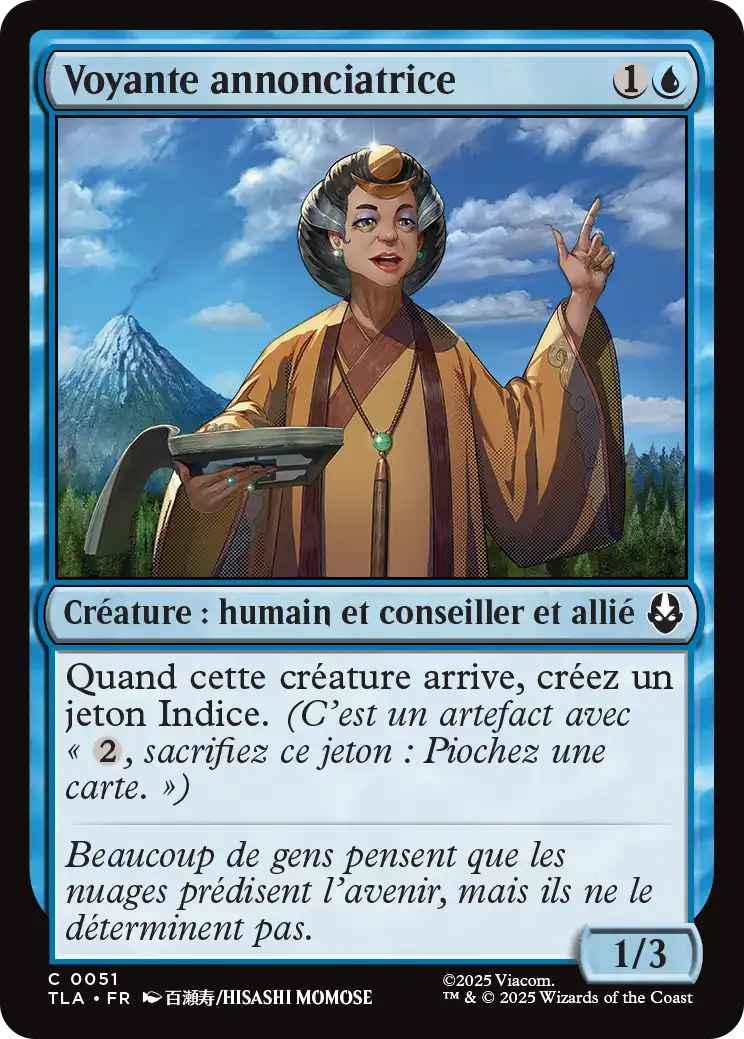 Voyante annonciatrice arrive en jeu avec un jeton indice. C'est un bon bloqueur en début de partie en tant que 1/3. Elle permet de faire arrive en jeu 2 permanents en une seule carte, et de piocher en sacrifiant l'indice.