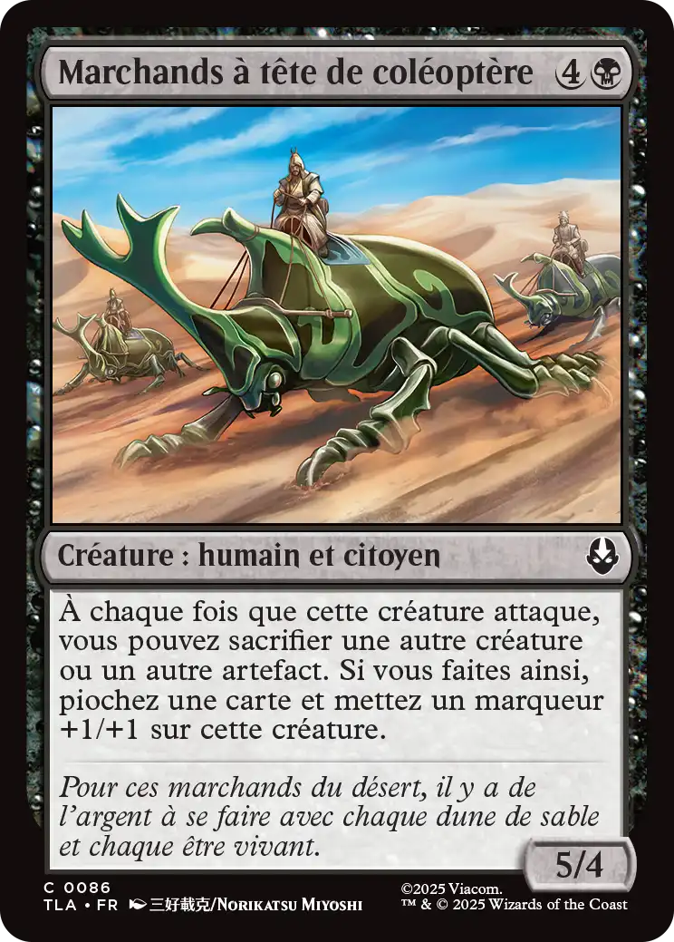 Marchands à tête de coléoptère est une 5/4 pour 5 manas qui vous permet de sacrifier une autre créature à chaque fois qu'elle attaque pour piocher une carte et gagner un marqueur +1/+1.