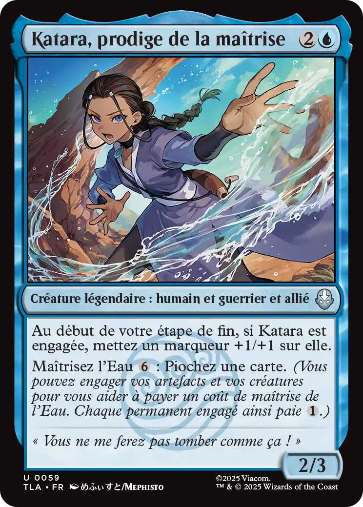 Katara, prodige de la maîtrise gagne un marqueur +1/+1 à chaque fin de tour si elle est engagée. Sa capacité de Maîtrise de l'Eau vous permet également de piocher. C'est une bonne manière d'utiliser l'intégralité de vos manas à chaque tour.