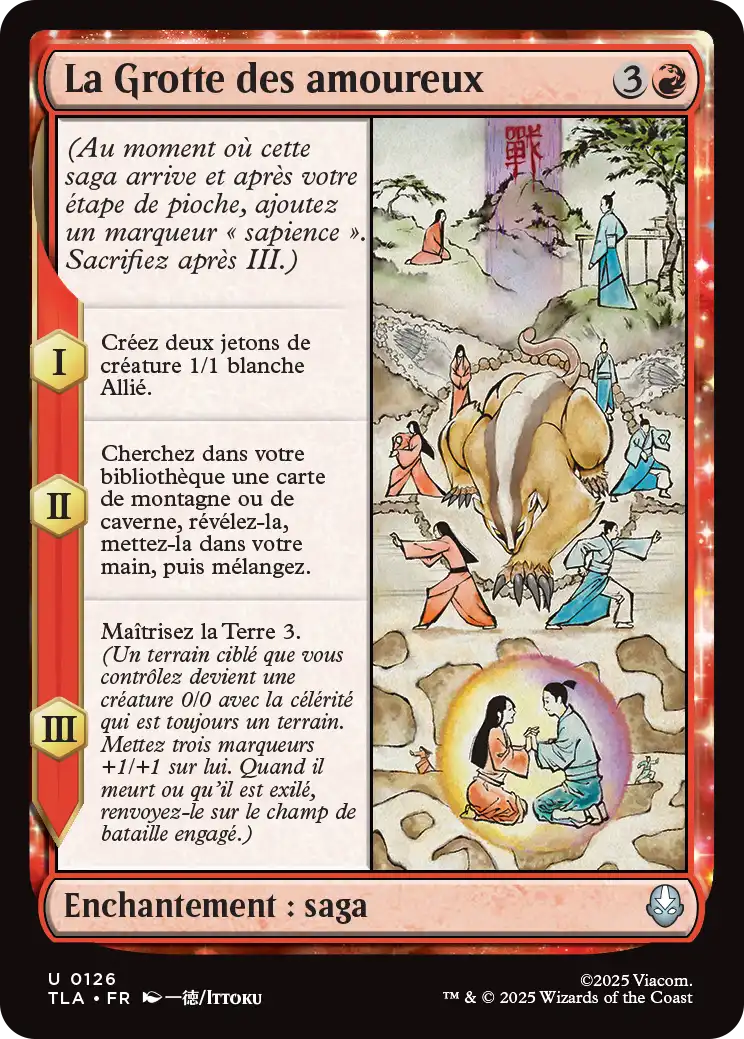 La grotte des amoureux est une saga qui vous permet de créer 2 jetons allié à son arrivée en jeu. Son 2ème chapitre vous assure de trouver un terrain en vous faisant chercher une montagne ou une caverne dans votre bibliothèque pour la mettre dans votre main. Enfin, son dernier chapitre vous fait maîtriser la Terre 3.