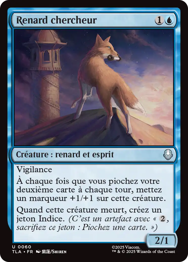Renard chercheur est une 2/1 avec la vigilance qui gagne un marqueur +1/+1 à chaque fois que vous piochez votre 2ème carte d'un tour, y compris pendant un tour adverse. À sa mort, vous obtenez un jeton indice.