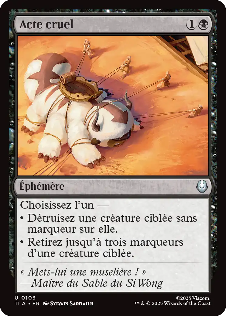 Acte cruel détruit n'importe quelle créature sans marqueurs sur elle pour 2 manas en éphémère. Vous pouvez également choisir de retirer jusqu'à 3 marqueurs d'une créature ciblée à la place.