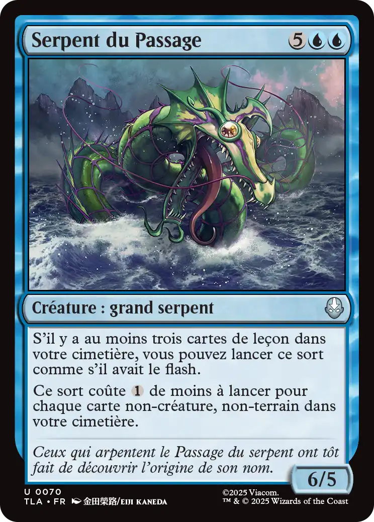 Serpent du passage est une 6/5 pour 7 manas qui peut se jouer en flash si vous avez au moins 3 leçons au cimetière. Son coût est réduit d'un mana incolore pour chaque carte non-créature et non-terrain dans votre cimetière. Il peut donc arriver très rapidement en jeu.