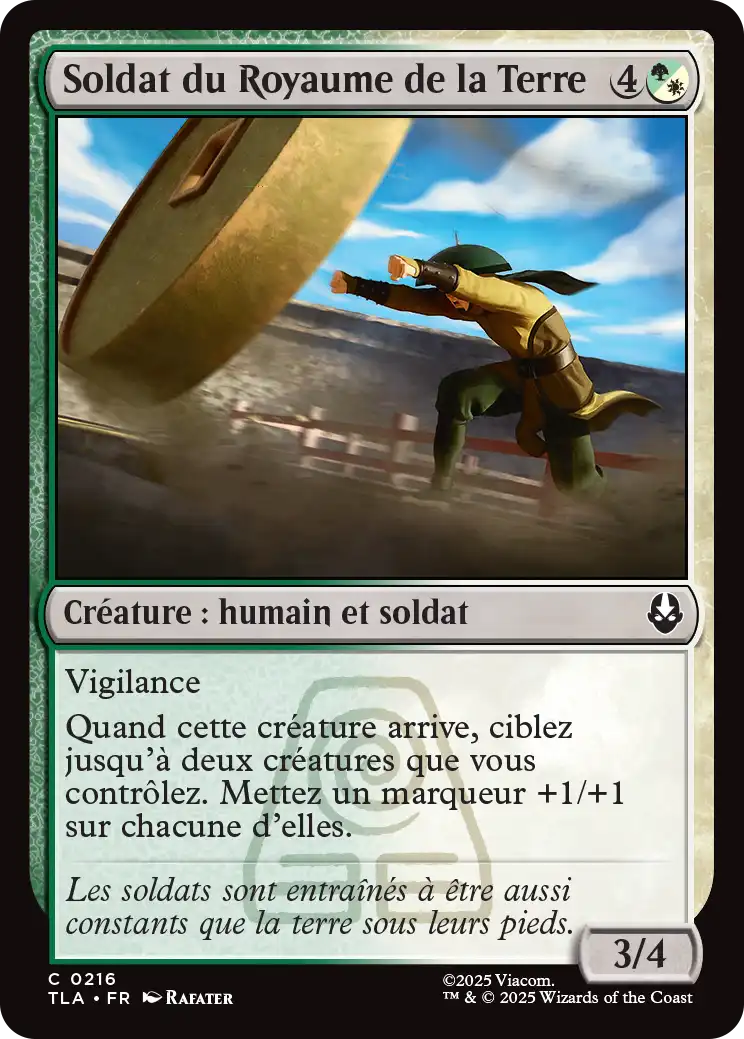 Soldat du Royaume de la Terre est une 3/4 vigilance qui donne un marqueur +1/+1 à jusqu'à 2 de vos créatures en arrivant en jeu.