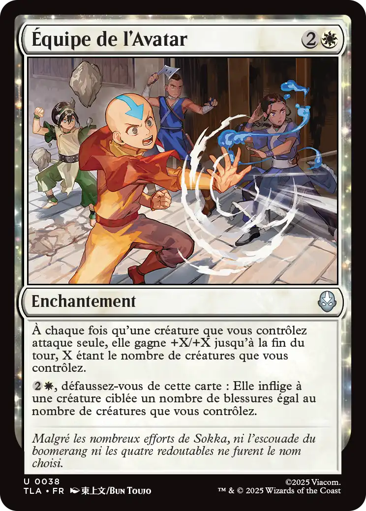 Équipe de l'Avatar est un enchantement qui booste une de vos créatures si elle attaque seule, en lui donnant +X/+X, X étant votre nombre de créatures. Cette carte polyvalente fait par ailleurs office de removal. Elle peut être défaussée depuis votre main pour infliger à une créature ciblée, un nombre de blessures égal au nombre de créatures que vous contrôlez.