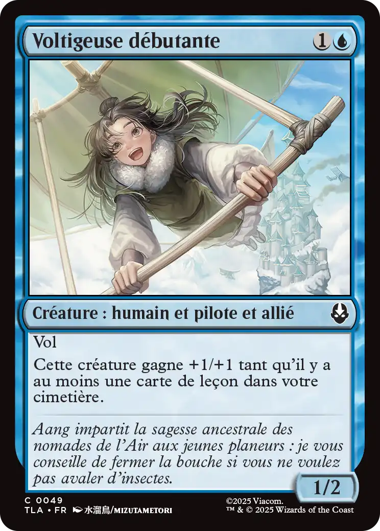 Voltigeuse débutante est une 1/2 avec le vol qui se joue à moindre coût avant de gagner un bonus de +1/+1 tant que vous avez une leçon au cimetière.