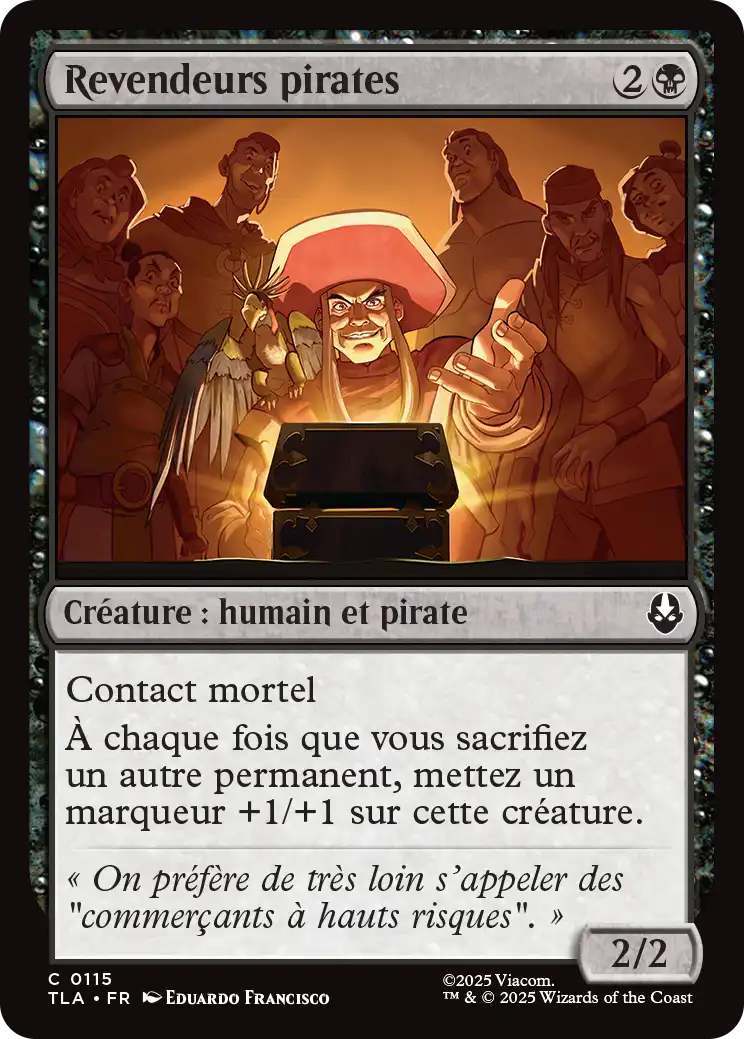 Revendeurs pirates est une 2/2 avec le contact mortel qui gagne un marqueur +1/+1 à chaque fois que vous sacrifiez un autre permanent. Cette capacité fonctionne avec tous les sacrifices, que ce soit avec les créatures ou les artefacts, et donc avec les jetons indice.