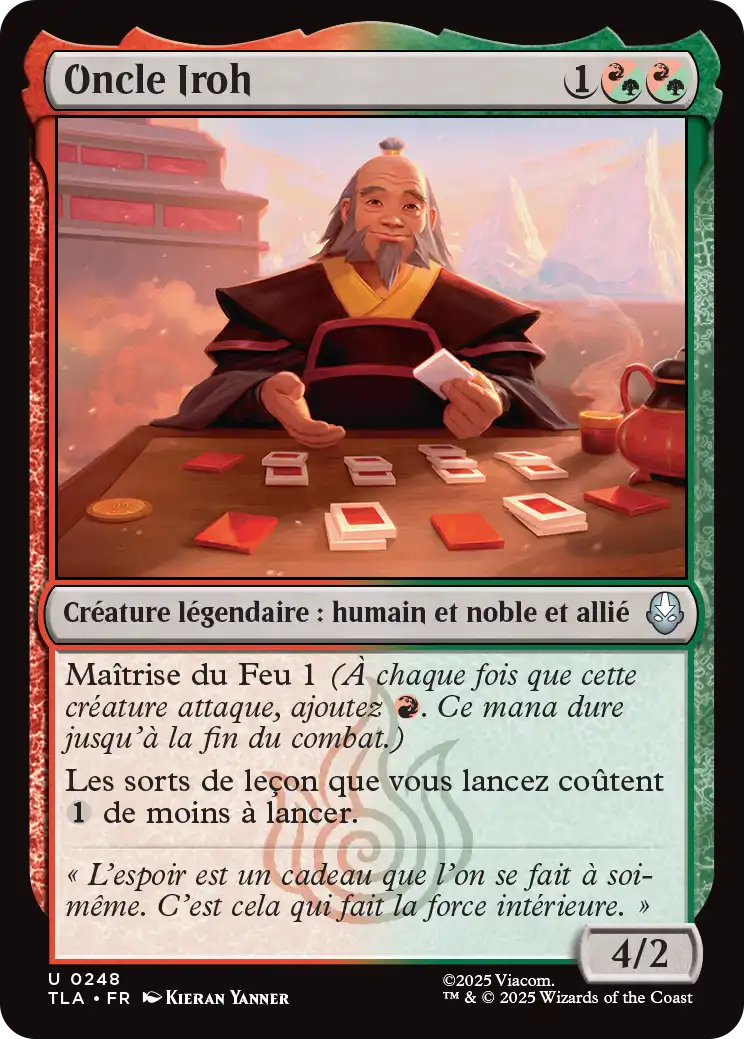 Oncle Iroh est une 4/2 qui vous permet de profiter des effets nécessitant une créature de force de 4 minimum. Il possède Maîtrise du Feu 1 et réduit d'un mana incolore les coûts de vos sorts de leçons.