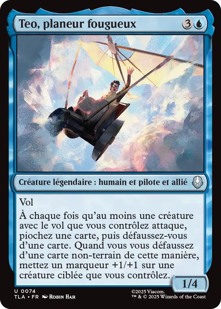Teo, planeur fougueux est 1/4 avec le vol. Lorsque vous attaquez avec une autre créature volante, il vous fait piocher puis défausser avant de mettre un marqueur +1/+1 sur une de vos créatures si la carte défaussée n'était pas un terrain. Vous piochez de nouvelles cartes et vous vous débarrassez des moins utiles tout en boostant vos créatures volantes.