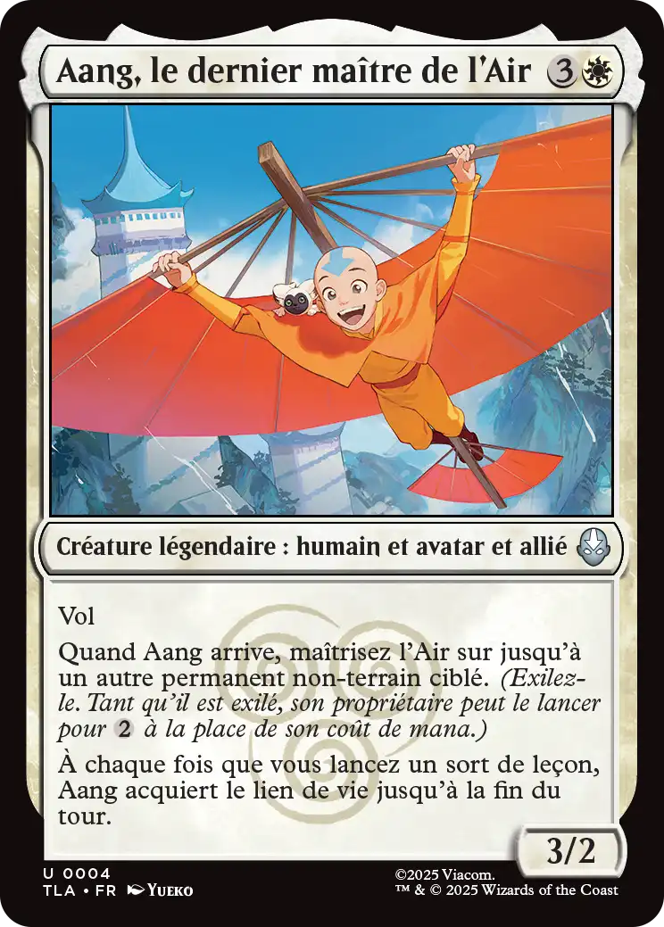 Aang, le dernier maître de l'Air est une 3/2 avec le vol qui vous fait maîtriser l'Air sur un autre permanent non-terrain ciblé. Vous pouvez ainsi vous débarrasser d'une menace adverse l'espace d'un tour ou renvoyer l'un de vos permanents en main pour le rejouer. À chaque leçon jouée, Aang acquiert le lien de vie et vous aide à gagner la course aux points de vie.
