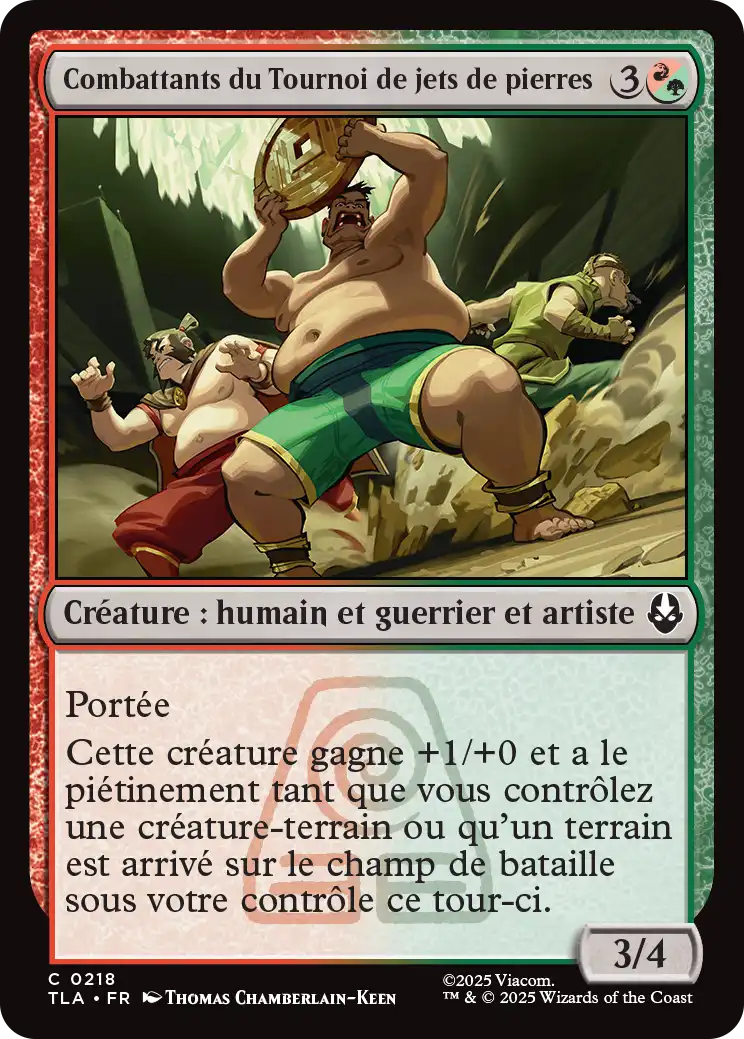 Combattants du Tournoi de jets de pierres est une 3/4 avec la portée qui gagne +1/+0 et le piétinement tant que vous contrôlez une créature-terrain ou si vous avez joué un terrain ce tour-ci.