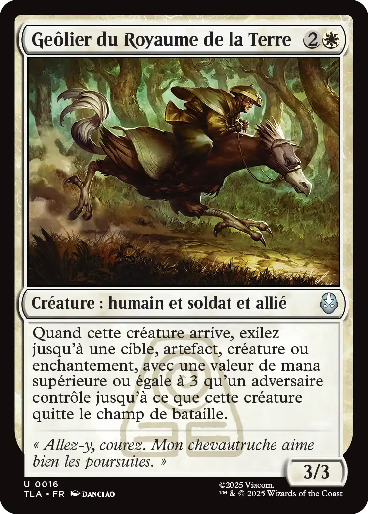 Geôlier du royaume de la Terre est une 3/3 pour 3 manas qui fait office de removal en exilant un artefact, une créature ou enchantement avec une valeur de mana de 3 ou plus lors de son arrivée en jeu et jusqu'à ce qu'elle quitte le champ de bataille.
