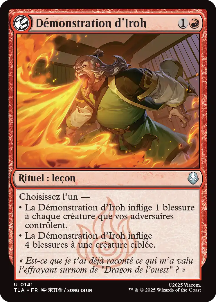 Démonstration d'Iroh est une leçon en rituel qui peut infliger une blessure à chaque créature adverse ou 4 blessures à une créature ciblée. C'est un bon anti-créature qui sera également efficace contre les jetons adverses, ou après une phase de combat pour achever les créatures qui ne disposent plus que d'un seul point de vie.