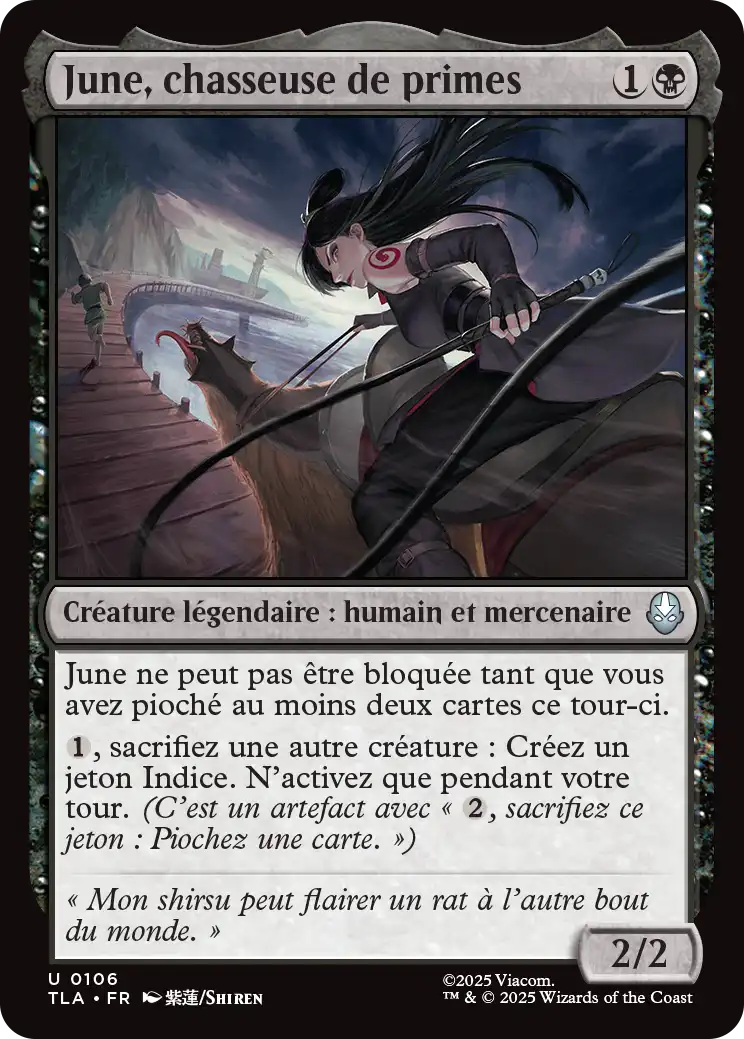 June, chasseuse de primes est imblocable si vous avez pioché 2 cartes ce tour-ci. Elle vous permet de sacrifier une autre créature en payant un mana incolore pour créer un jeton indice.