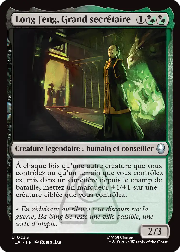 Long Feng, Grand secrétaire met un marqueur +1/+1 sur une de vos créatures à chaque fois qu'une autre de vos créatures meurt.