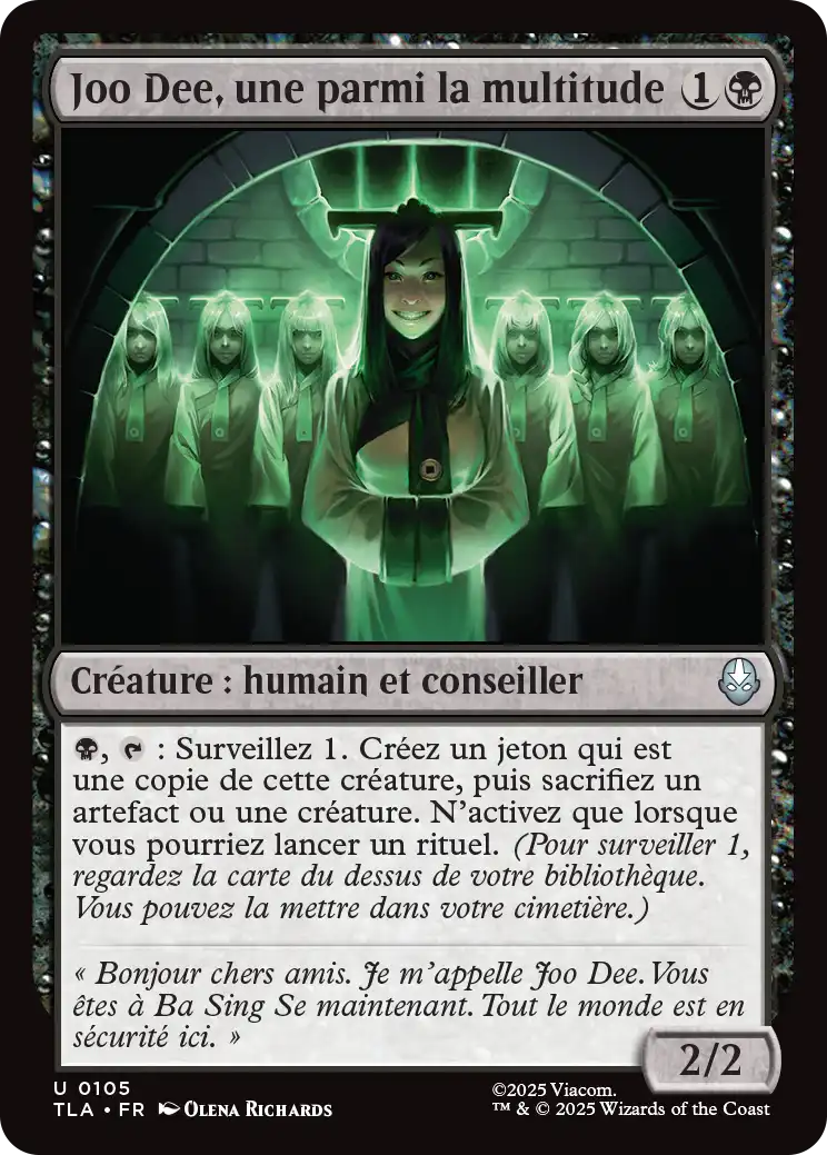 Joo Dee, une parmi la multitude est une 2/2 pour 2 manas. Elle peut s'engager en payant un mana noir pour surveiller 1, avant de créer un jeton qui est une copie d'elle-même. Vous sacrifiez ensuite un artefact ou une créature. En surveillant, vous contrôlez vos futures pioches tout en alimentant votre cimetière, et Joo Dee vous fournit à tous les tours un jeton que vous pouvez sacrifier à sa propre capacité.