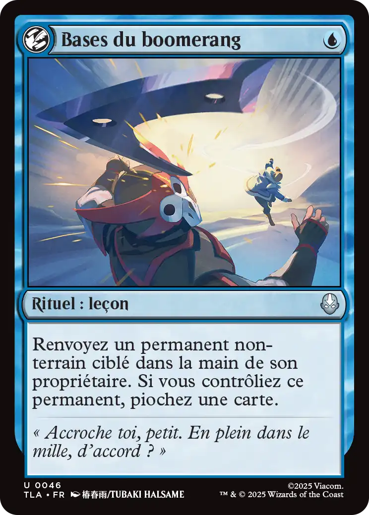 Bases du boomerang est une leçon qui renvoie un permanent non-terrain dans la main de son propriétaire. Vous pouvez ainsi vous débarrasser d'une menace adverse l'espace d'un tour. Joué sur l'une de vos créatures, il vous fait piocher.