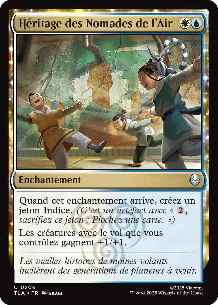 Héritage des Nomades de l'Air est un enchantement pour 2 manas qui vous fournit un jeton indice vous permettant de piocher, en plus de booster toutes vos créatures volantes en leur donnant +1/+1.