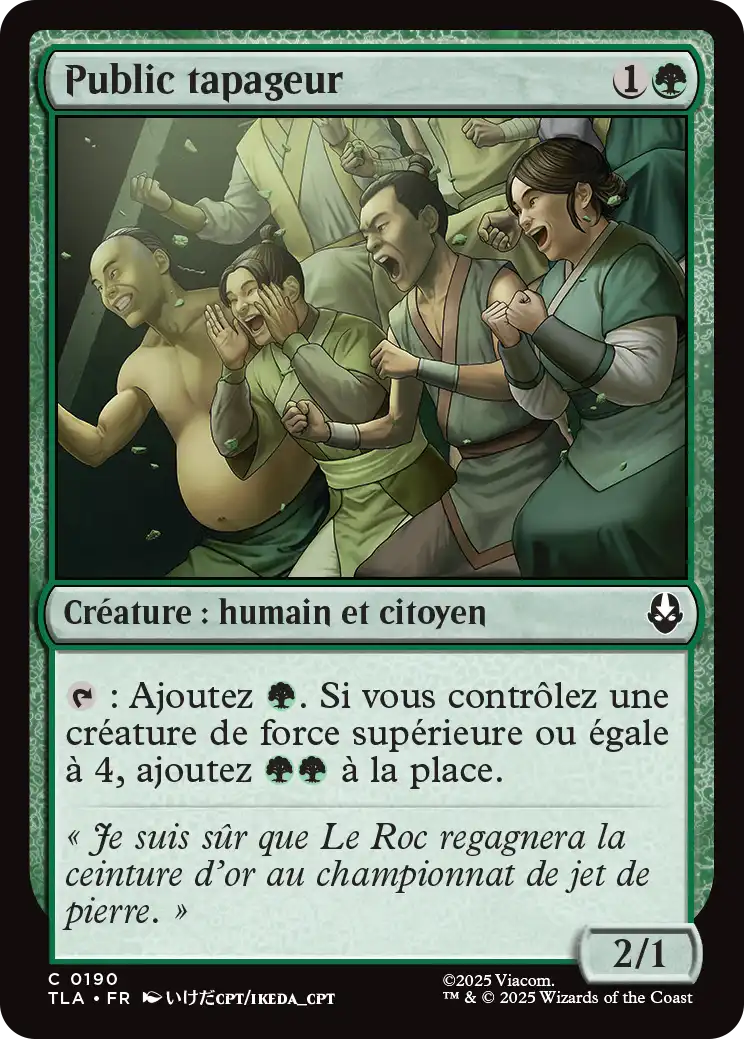 Public tapageur est une 2/1 pour 2 manas qui s'engage pour produire un mana vert. Vous ajoutez deux manas verts à la place si vous contrôlez une créature de force 4 ou supérieure.