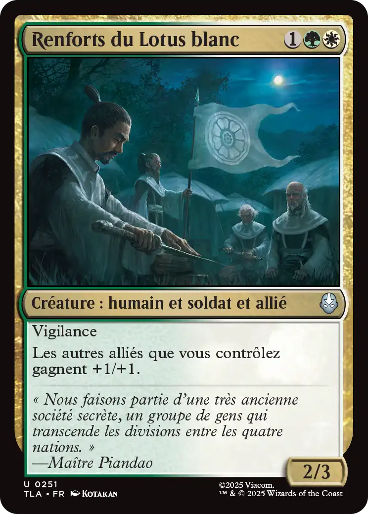 Renforts du Lotus Blanc est une 2/3 avec la vigilance pour 3 manas et qui octroie un bonus de +1/+1 à tous vos autres alliés.