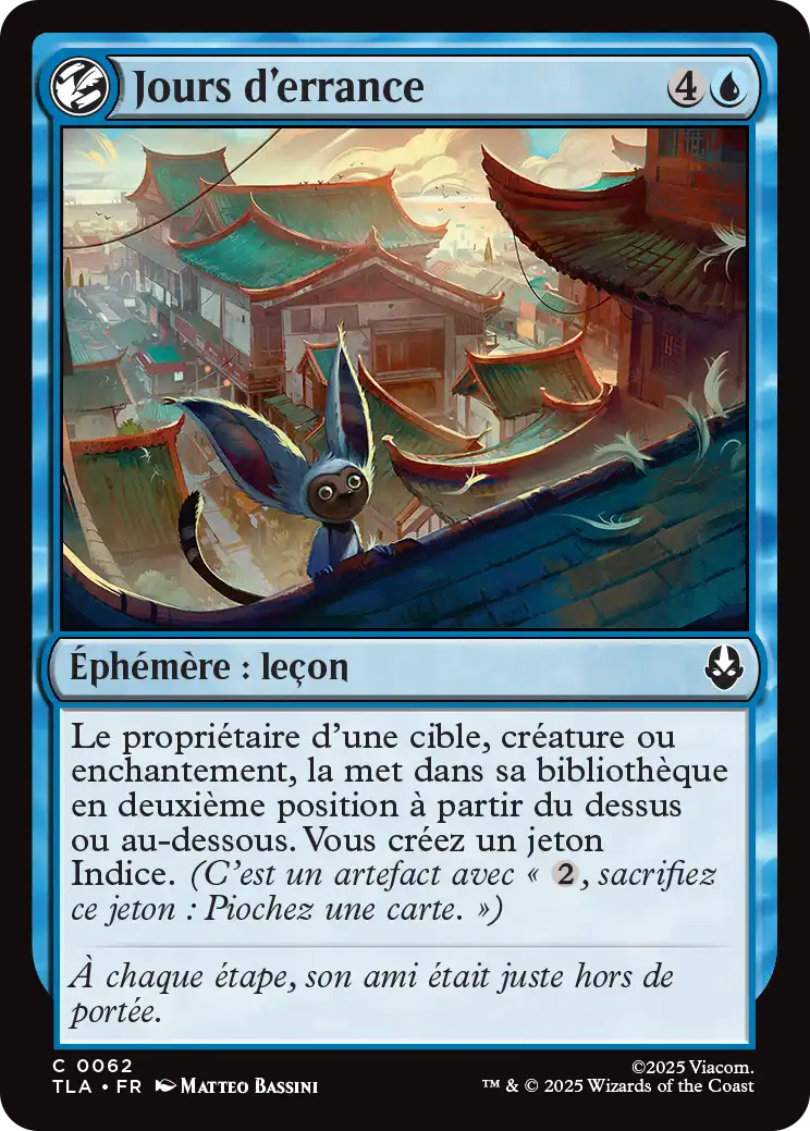 Jours d'errance est une leçon en éphémère pour 5 manas qui envoie une créature ou un enchantement ciblé en 2ème position dans la bibliothèque de son propriétaire. Vous créez également un jeton indice qui vous permet de piocher en plus d'avoir géré de manière temporaire un permanent adverse.