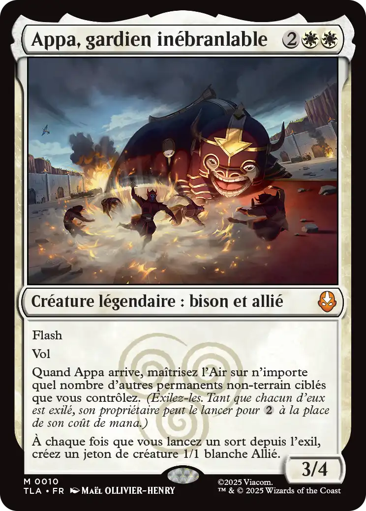 Appa, bison volant loyal est un 4/4 avec le vol. À chaque attaque, il vous permet au choix de donner le vol à l'une de vos créatures ou de maîtriser l'Air sur l'un de vos permanents non-terrain.