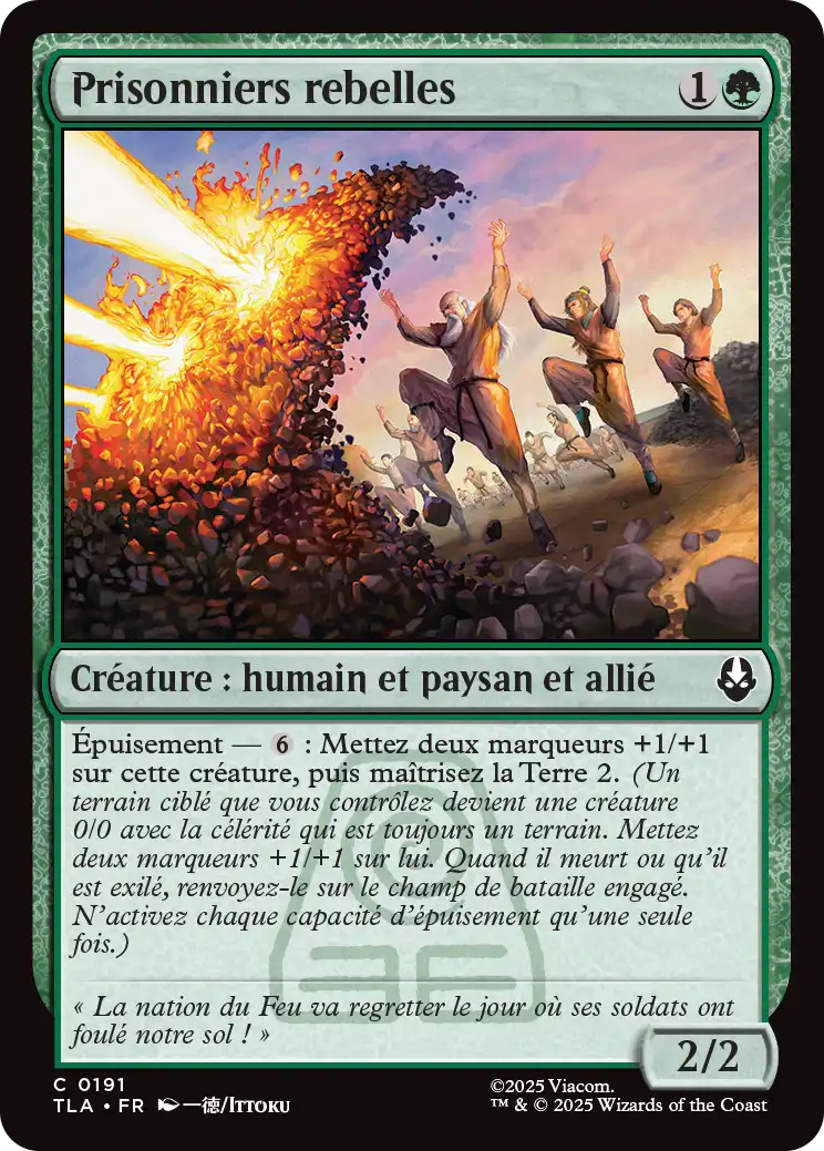 Prisonniers rebelles est une 2/2 pour 2 manas. Se capacité d'épuisement s'active en échange de 6 manas incolores et vous permet alors de lui donner deux marqueurs +1/+1 avant de maîtriser la Terre 2.