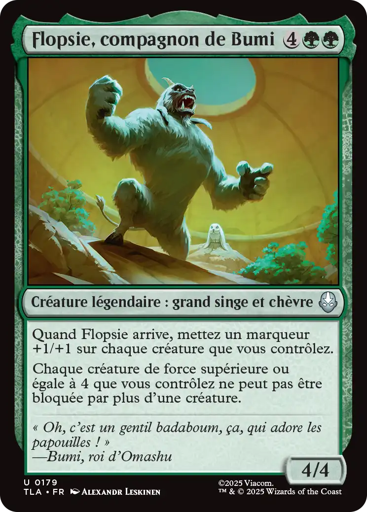 Flopsie, compagnon de Bumi est une 4/4 pour 6 manas qui donne un marqueur +1/+1 sur chaque créature que vous contrôlez, y compris Flopsie. Toutes vos créatures de force supérieure ou égale à 4 ne peuvent plus être bloquées par plusieurs créatures.