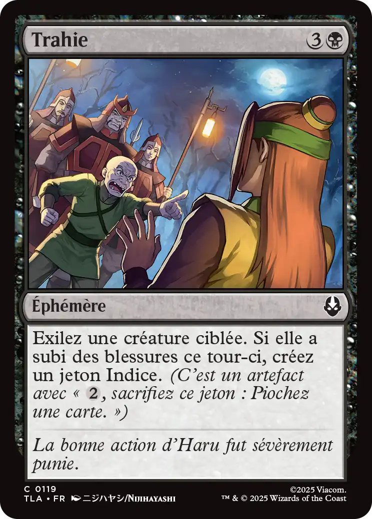Trahie est un removal qui exile n'importe quelle créature, en plus de vous donner un jeton Indice si cette créature avait subi des blessures ce tour-ci.