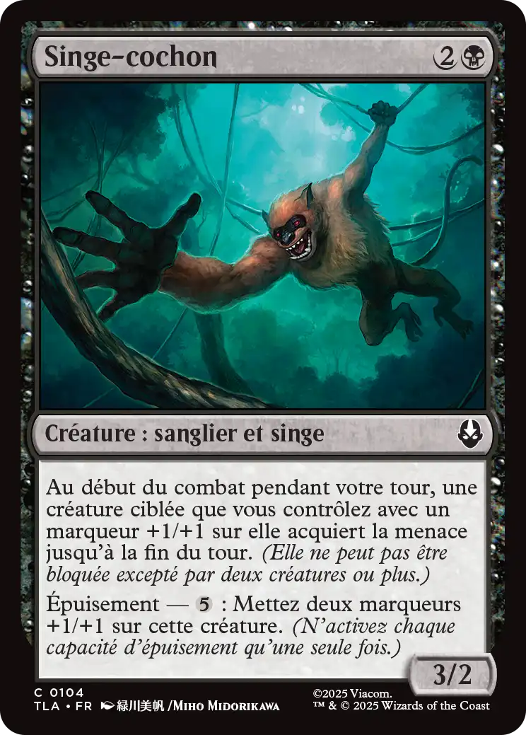 Singe-cochon est une 3/2 pour 3 manas qui donne la menace à une créature ciblée avec des marqueurs sur elle à chaque début de combat. Sa capacité d'épuisement vous permet une fois dans la partie de lui donner deux marqueurs +1/+1 en payant 5 manas incolores.