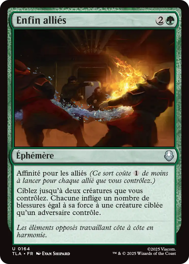 Enfin alliés est un éphémère pour 3 manas qui permet à deux de vos créatures d'infliger autant de dégâts que leurs forces à une créature adverse. Grâce à l'affinité, le coût de ce sort peut être réduit à un simple mana vert si vous contrôlez au moins 2 alliés.