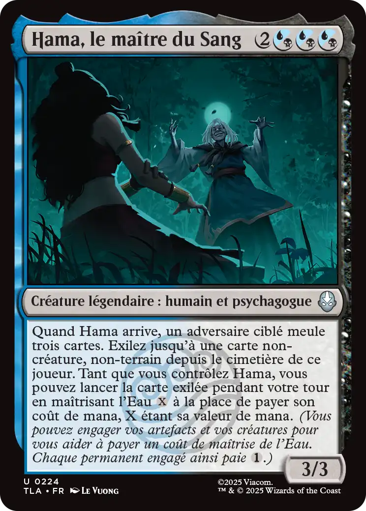 Hama, le maître du Sang est une 3/3 pour 5 manas qui meule votre adversaire de 3 cartes. Exilez ensuite une carte non-créature et non-terrain de son cimetière. Vous pouvez jouer cette carte tant que Hama reste en jeu en payant autant de manas incolores que le coût de cette carte, avec l'aide de la Maîtrise de l'Eau.