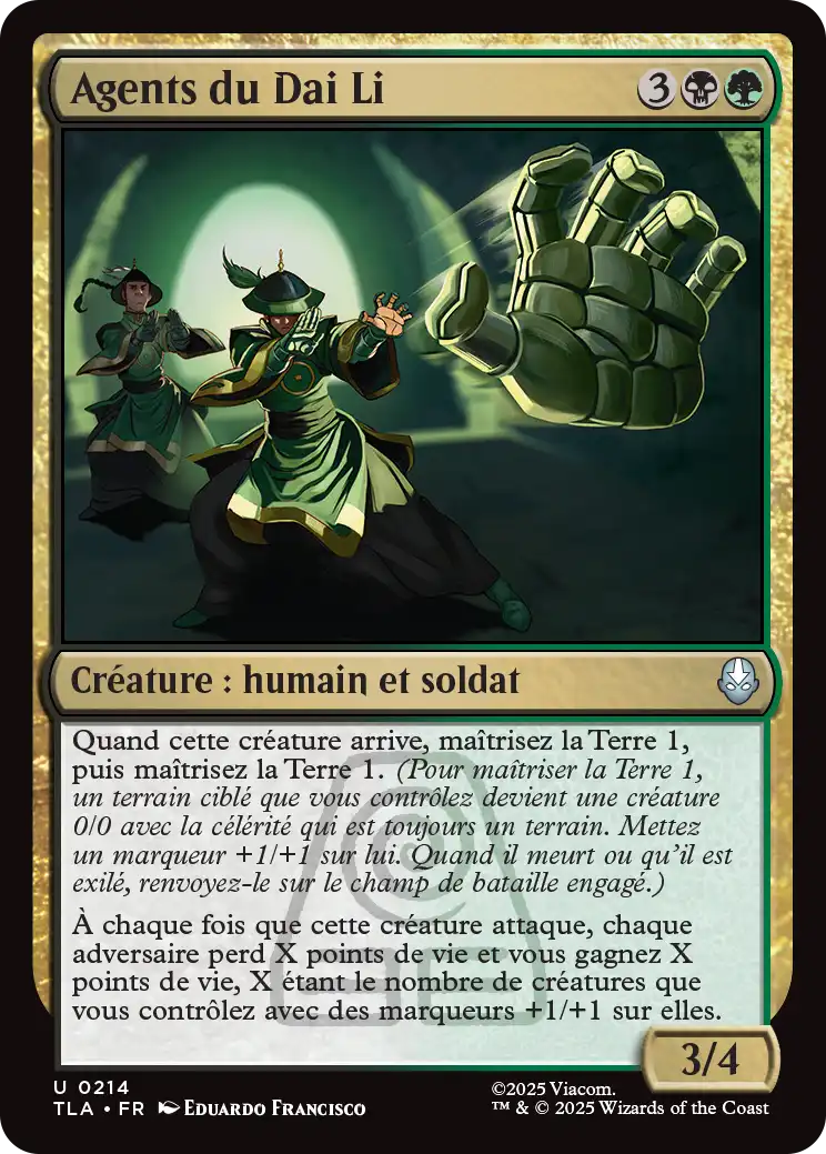 Agents du Dai Li est une 3/4 pour 5 manas qui vous fait maîtriser la Terre deux fois lorsqu'elle arrive en jeu. En attaquant, vous faites perdre X points de vie à chaque adversaire et vous gagnez X points de vie, X étant votre nombre de créatures avec des marqueurs +1/+1 sur elles.