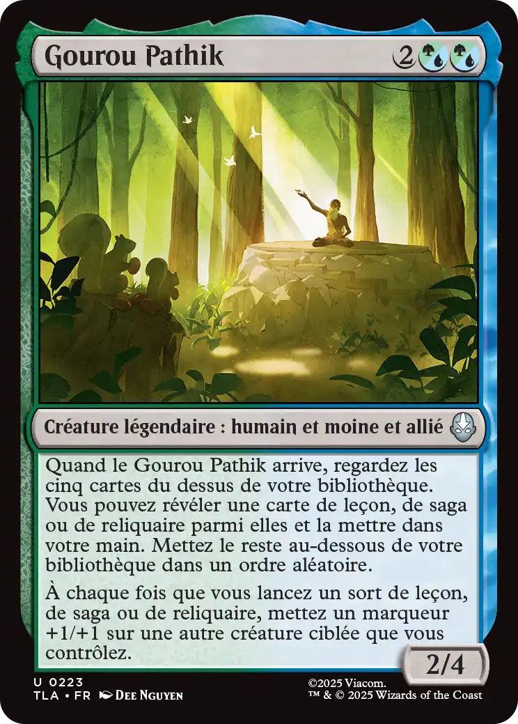 Gourou Pathik vous permet de regarder les 5 cartes du dessus de votre bibliothèque lorsqu'il arrive en jeu. Révélez une leçon, une saga ou un reliquaire à mettre dans votre main. À chaque fois que vous jouez une leçon, une saga ou un reliquaire, vous mettez un marqueur +1/+1 sur l'une de vos créatures.