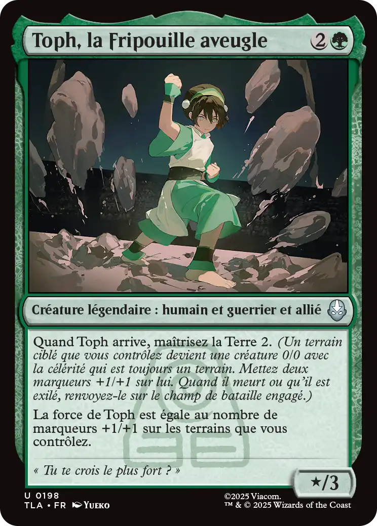 Toph, la fripouille aveugle vous fait Maîtriser la Terre 2 en arrivant en jeu. Sa force est égale au nombre de marqueurs +1/+1 sur les terrains que vous contrôlez. Vous obtenez donc au minimum une 2/3 et un terrain 2/2 pour seulement 3 manas.