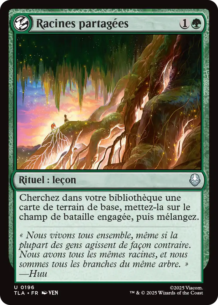 Racines partagées est une sort de Ramp pour 2 manas verts. Il vous permet d'aller chercher dans votre bibliothèque et de mettre en jeu engagée, une carte de terrain de base. Vous obtenez un terrain supplémentaire pour accélérer votre sortie et vous vous assurez d'avoir accès à la couleur de mana de votre choix.