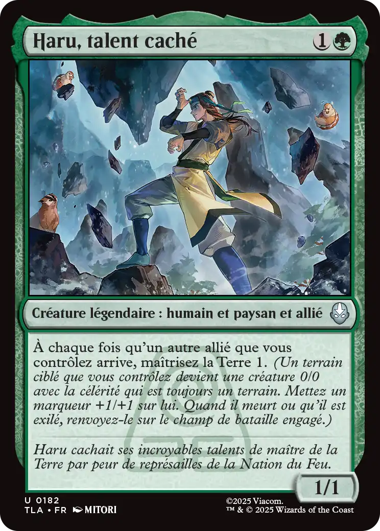 Haru, talent caché est un allié 1/1 pour deux manas qui vous fait maîtriser la Terre 1 à chaque fois qu'un allié arrive en jeu sous votre contrôle.